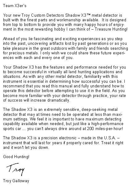 Shadow X3ers, In this day and age it is not easy to start a new company with new products and compete successfully with the larger and well-established companies. This is the reason I want to express my sincere appreciation to you for becoming an owner of a Shadow X3 detector. This is currently my lightest, most powerful, true turn-on-and-go detector. Customer Satisfaction is my top personal goal and objective. It is a simple deduction, if you are not happy with your Shadow X3 then I also cannot be happy. As the Owner of Troy Custom Detectors, Inc. and a fellow detectorist, I want you to contact me personally if you ever experience a problem with your Shadow X3 that is not resolved to your satisfaction with our normal Customer Service channels. I can be reached at 1-877-437-4345 (toll free). I wish you the best of luck with the finds you make with your new Shadow X3 and hope to see you in the field. Best Regards