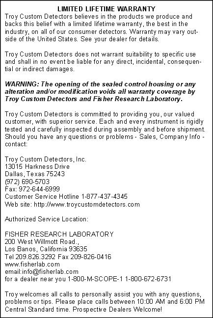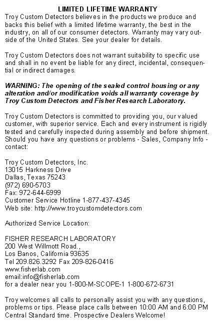 RESPONSIBLE DETECTING Permission to access property, search, retrieve and keep found items should always be obtained whenever possible. This necessary prerequisite will prevent any problems that may arise (if you search without permission) and will give you complete peace-of-mind while detecting. Some remote, wooded, abandoned or forgotten sites are nearly impossible to get prior permission to search, as the property owner is unknown and/or difficult to locate. It is often a good idea to question local residents near the site to see if the owner can be identified and permission obtained. Make certain that you respect all property no matter how remote, secluded or forgotten it may be. Fill all holes! Never leave an unfilled hole! It is the mark of an uncaring amateur; It does not look good and it gives all detectorists a bad name and image. Do No Damage! This is just common sense! Respect all property as if it were your own! Leave No Trash! If you dig it, take it with you! All small, retrieved trash items should be placed in your detecting pouch to be disposed of properly. Besides, you do not want to have to dig the same piece of trash over and over again! Large trash items which cannot be easily carried are best piled in one spot and then reburied before you leave the site. Create a Positive Image while detecting. You may be observed directly or indirectly. A landowner may have a good or bad experience with a detectorist, which he then passes on to others. You never know where the 'trail' may lead or end. Always present a good image ... it is the best policy. As a detectorist, you may be requested at times to search for a lost item. Maybe a landowner needs a property marker located or perhaps someone has lost a ring or set of keys. Perhaps the police or other agency may need assistance in locating evidence from a crime scene. Always, willingly lend assistance where needed. Not only will you feel good in doing so, but it serves a very useful purpose and presents metal detecting and detectorists in a very positive manner. CARE & STORAGE Your Troy Shadow X3 metal detector is a high-quality, precision-engineered and constructed electronic device. Properly cared for, it will provide many years of trouble-free service. Common sense and reasonable care are the keys to keeping your Shadow X3 in good working order insuring a long trouble-free life. Avoid temperature and humidity extremes. The X3 will work well in a range of temperatures from about 20 to 110 degrees Fahrenheit and 0 to 100% relative humidity. Do not leave or store the detector in extremely hot, cold or humid areas. Never submerge the control box in water and always protect it from heavy rain or blowing surf spray. When being stored, or not used for extended periods of time, remove the battery to eliminate any possible chance of leakage damage. A coil cover is highly recommended to protect the search coil from abrasion and possible pinhole punctures that can eventually result in water intrusion and destruction of the search coil. The search coil is waterproof, but needs to be taken care of and protected. While searching, avoid hitting the search coil against rocks, trees or other hard surfaces. Keep your search coil slightly elevated above the ground. Especially when searching sand, gravel or hard, rocky ground. Periodically, wipe any accumulated dirt from the control box, knobs, switches, shaft and search coil with a soft cloth. Also, remove the coil cover occasionally and clean any accumulated dirt buildup, which could affect operation. Do not over-tighten the search coil cable connector (at the control box) and keep the coil cord neatly wrapped and secured to the pole assembly. Leave enough slack in the cable, just above where it enters the coil, so that the coil is easily adjustable through its entire 'tilt' range without stressing the cable or its entry point into the search coil. Treat your Troy Shadow X3 metal detector with care and you will be assured of many trouble-free years of operating enjoyment. GLOSSERY 10-Turn - A very precise, high-resolution electronic potentiometer (control) that divides its total resistance over ten physical 360-degree rotations of its control shaft. Usually used for ground balancing. Acceptance - Any metallic target that is not eliminated (rejected) by the discrimination control and/or Target Check and produces a signal (audio tone) when scanned by the search coil is considered to be accepted. Air Test - The process of sampling a target with the search coil elevated in the air and away from any other interfering metal target, except the one being sampled. Air testing is a valid and useful method to determine maximum potential detector depth capability, discrimination-points of various targets and their audio characteristics. It is to be used for 'guideline' results only, as air-test results can vary for targets buried in the actual soil matrix. All-Metal Mode - An operating mode that responds to any metallic item thus producing an audio tone from the detector's speaker or headphones. Amplitude - The strength or 'volume' of a signal. Auto-Tuning - An electronic automatic tuning method of keeping the threshold signal constant and unwavering. Auto-Tuning Speed - The speed at which the auto-tune circuit updates or refreshes the threshold tuning to keep it at a constant audio level. Back Reading - A strong, reflected signal from a target that is very near the search coil. These false target responses can be eliminated by raising the search coil away from the offending item. Black Sand - Sand that contains a high-percentage of magnetic negative iron oxide. Conductivity - The property of an object that deals with how easily an electric current can pass through it. Gold, copper and silver are highly conductive. Iron is not. All-metal objects have conductive properties that depend on their metal type, alloy, size, etc. Conductive Salts - Water, moist or wet sand or soil that contain positively-conductiv
