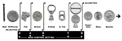 At a setting of 3, most small iron targets will be rejected and everything from foil on up will be accepted As shown in the illustration below. BATT TEST - A battery test is performed when the DISC control is set to the BATT TEST position. (see Battery page) Always use the least amount of discrimination possible. High discrimination settings can eliminate many desirable targets, increase target masking and decrease detection depth.