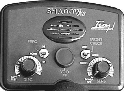 Shadow X3 will not! QUICK-SET DETECTING Your Troy Shadow X3 metal detector is very easy to operate! As you become accustomed to its various features and controls, your knowledge will improve of which features and settings perform best for different types of detecting, search and soil conditions encountered and locales. To simplify getting started, you may simply want to set the DISC and SENS controls to their black preset positions. These are the number 3 position for the DISC control and the number 8 position for the SENS control. Set both the FREQ and TARGET CHECK switches to their NORM position. Keep in mind that these are general, average settings and may not always provide optimum results. As your knowledge, experience and proficiency expand, you will likely want to experiment somewhat and 'fine tune' the X3's operation to suit your particular style of detecting and the search sites soil and trash conditions. Do not be afraid to experiment ... It's part of how you learn! HEADPHONES Your Shadow X3 is equipped with a water-resistant rear-mounted ¼-inch (6.3mm) stereo headphone jack. Located on the back side of the control box, the jack accepts most stereo and mono headphones with an impedance rating of 8 ohms or more. Upon use, the internal speaker is automatically disconnected. The use of high-quality, high-sensitivity headphones - like the Troy-PRO headphones - is strongly encouraged and recommended. Headphones block-out background noise while detecting and enable deep, low-volume signals to be heard more easily. They also help with 'target perception', thus making pinpointing much easier. Headphone-use increases battery life. All-in-all, headphones should always be used while metal detecting!