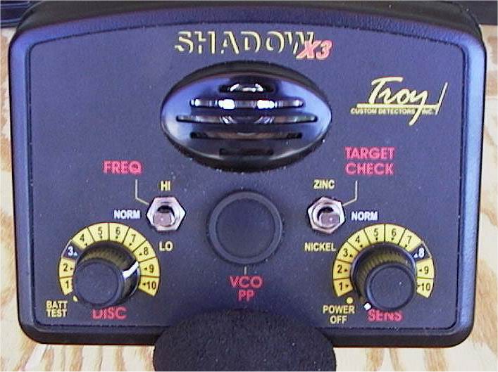THE SHADOW X3 AND SHADOW X2 A closer inspection will reveal that the X2 has fewer controls on the control housing than the X3. If you happen to own a Shadow X2, you would notice that there is one more control on the X3 than the X2, the FREQUENCY TOGGLE. In addition, the TARGET CHECK on the X3 has more functions than the COIN CHECK on the X2.