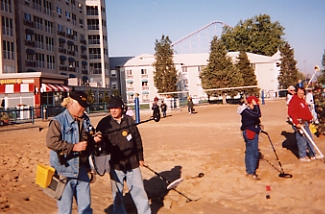 would probably fit into a thimble. All I know is that you have to be fast. You also need a detector that is easy to pinpoint, and has a fast recovery speed.I had the opportunity to test the X-5 as a competition hunter at the recent FMDAC National Convention Hunt in Ohio. It was a sand hunt, and as such, I knew the fields would be quickly searched. If you don't get out of the "gate" fast and really pump during that first 15 minutes, you probably won't fare too well at the end of the hunt. I found the Shadow X-5 to be an excellent competition hunting machine. Its light weight and ease of pinpointing were outstanding. The frequency shifter came in very handy for the frustrating "cross chatter" that you can normally expect to find on the hunt field when searching in close proximity to other hunters. With just a flip of the switch the chatter was gone, with o time loss during those precious initial moments of the hunt. With three frequency positions it was easy to search the field and "thread the needle" around the other detector frequencies.