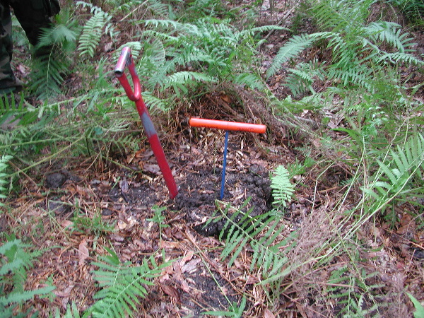 Next use the probe to re-locate the target.This is a four foot probe, the tip is on the shell, which is still in the ground at this point.