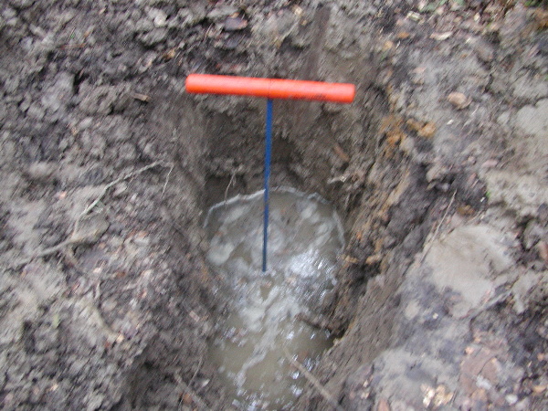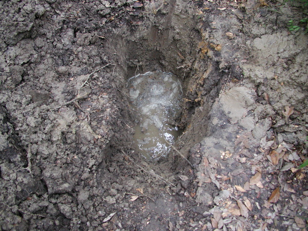 After cutting through roots and down into the mud...the shovel has just hit iron and the hole begins to fill with water and the target has to be relocated with the probe.This hole is over 3 feet deep! Water has filled it up while digging.