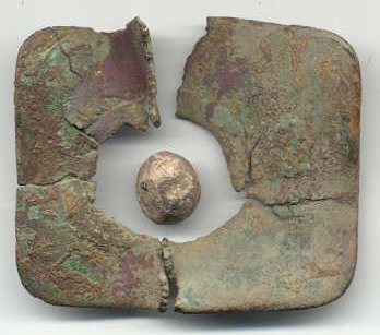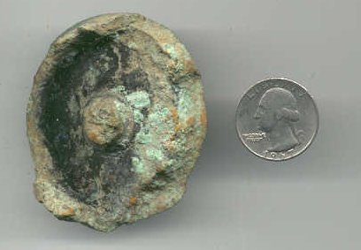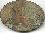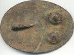 The british plate, U.S. box plate , the 1812 plain shoulder belt plate, Louisiana button and a carved bullet. The british plate has a musket ball placed in the hole to show what probably happened to it. Soldiers using it for target practice.I found it at a place where no british soldiers ever set foot but there were plenty of 1812 americans there. One probably had it as a souvenier and used it as a target. |
