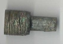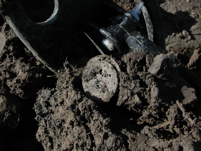 The fuse I am holding in my hand along with a carved lead pencil were found in the same hole with the X-5. 2nd Image: The fuse and lead pencil was found with the 7 inch coil. The fuse was 19 inches deep! That is a piece of coarse wool cloth on the coil that was imbedded in the fuse threads.