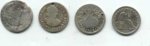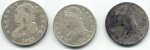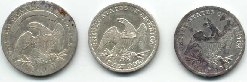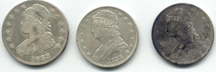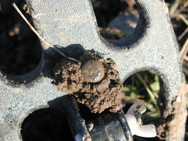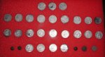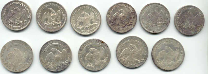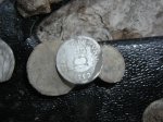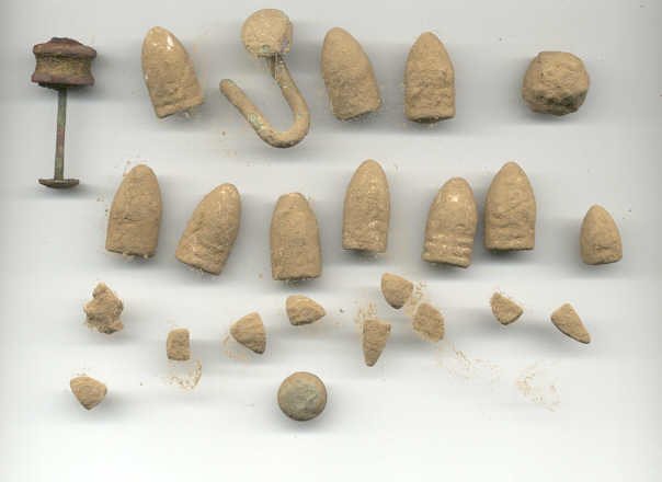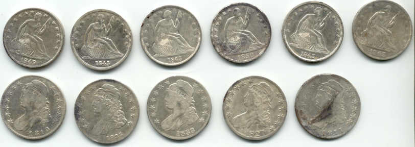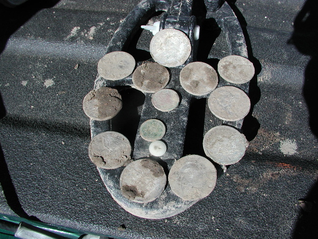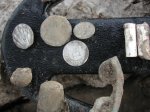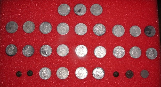 | 5 Inch Coil Comes Thru Again!!! Pix,Pix Went out Saturday looking for some more silver half dollars and decided to search a new area in the vicinity where the others were found...bad idea...but you never know. All I got were these do-dads, a silver thimble, part of an ornate salt cellar spoon, a spenser casing, a minnie,rivets,pipe stem, etc. So, Sunday...I decided to wade into the muck and water where I found 11 others previously with the "Dirty D". The only problem...it is so iron infested it is nearly impossible to hunt. So, I put on the 5 inch coil instead and started working the muck very,very slowly and guess what? The first one was right between a large iron bolt and a piece of flat iron and the 5 inch coil nailed it.I had searched the area before with larger coils and missed these 3. I wish I had brought my camera to take pix of the iron and the muck. It took me an hour to clean my detector afterwards! And here's the ladies tail-feathers..so to speak. Then they went into the case with the other 22 to make a total of 25. 12 Philadelphia Bust and 13 New Orleans Mint Seated liberties dating from 1809 to 1850. (Also in the case a Connecticutt cuff and two Voltigeur's cuffs, a shield nickle and a barber nickle.) I worked the area for another two hours after finding the third one but couldn't find anymore. Could be all there is...but I thought that a week ago. ago. Just goes to show, one coil doesn't do it all, you gotta have the arsenal. If you don't have the right coil to solve your ground condition problem you just not gonna find it. Jan 31, 2005