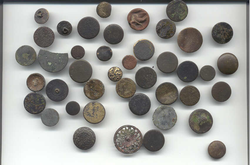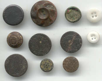 Here is a sampling of various buttons dug at the same site as below. As you can tell they cover quite a period of time. This is the 12'th Infantry Regiment button I dug. It is pewter and dates to 1798.It is remarkable that it survived.It says "United States" around the rim and encircles a "12". They appear to be rather crudely made buttons. One small piece is missing. This button is pictured in Albert's Button book on page 19 as R12. This is also a pewter Infantry button dug at one of Andrew Jackson's camps.It is listed as A4 on page 23 of Albert's book and dates 1812 to 1815. A small section of the rim disintegrated as it came out of the ground.I was afraid the whole button was going to go as pewter buttons sometimes do but it has held up. Richard in N.O