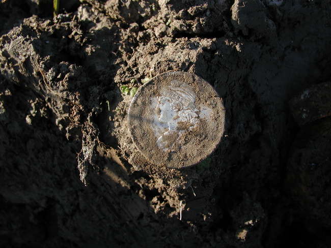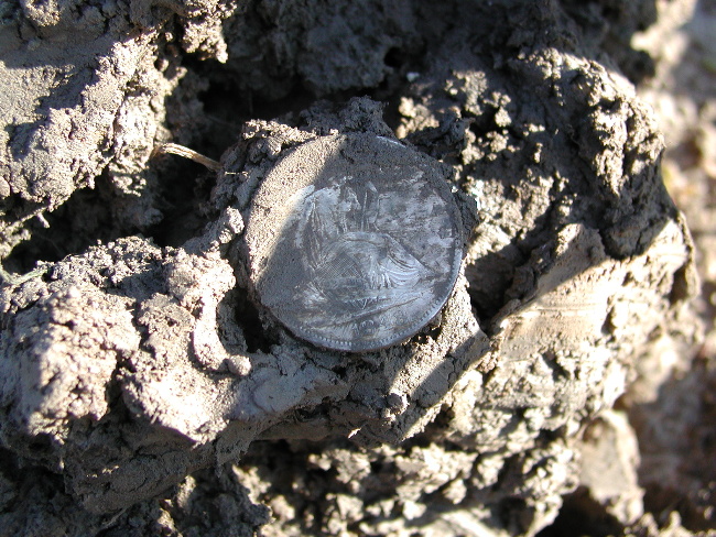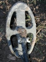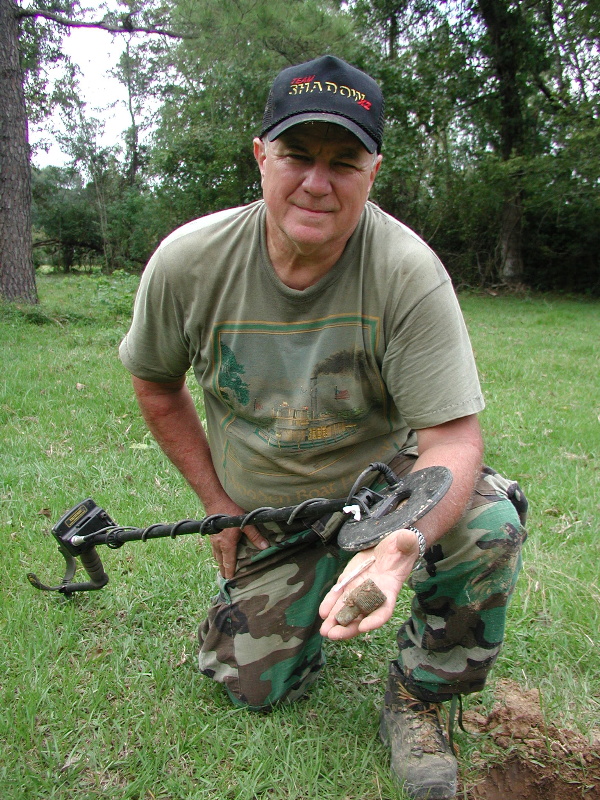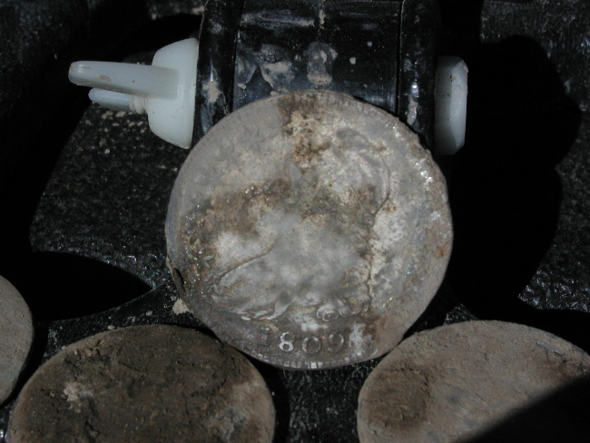 I put it on the X-5 and took it to an iron and trash infested field today and its depth and ability to separate trash from good targets was simply amazing. This first pix shows the first 5 liberty bust and seated halves I dug in one hole right next to that nasty piece of iron. I heard the iron and then..I heard the silver! That wheatie was in there , too! Just a few feet away another Philadelphia lady popped up.Look at the detail on that coin! You can read liberty on her headband and see every strand of hair! Most of these coins are in You might have noticed it was a tad muddy today...Louisiana Dust...I posed the next one, a seated liberty on the Double "D". And here's another 1843 seated that turned up a swing away. The next target was great! Two halves stuck together, a Philadelphia bust and a seated N.O. mint liberty! And here's the take for the day..4 Philadelphia Liberty's 1809, 1819, 1824 and 1831 and 7 New Orleans Mint Seated Liberty's 1843, 2 1844's , 1845, 1846 and 2 1848's. 1 1899 "V" Nickel and a wheatie whose date I cannot see. And here is a close up of the 1809...She looks pretty good for an old lady! I just can't say enough about this new coil, I was impressed with the prototype but puting it to the "Acid Test" in this trashy field proved to me without a doubt that it is going to be a very valuable tool in my relic hunting arsenal. The coins are going through a series of boiling water baths and when they are finally clean, I'll scan and post them. A tip on using this coil in heavy trash: go slow and listen carefully,most of these coins didn't hit "hard" because of the proximity to trash but there was no doubt they were diggable targets. The two I dug with no trash around rang out big time! Thanks for looking. Dec. 18, 2004