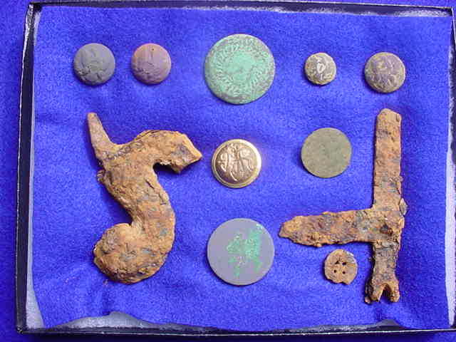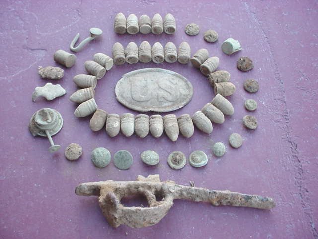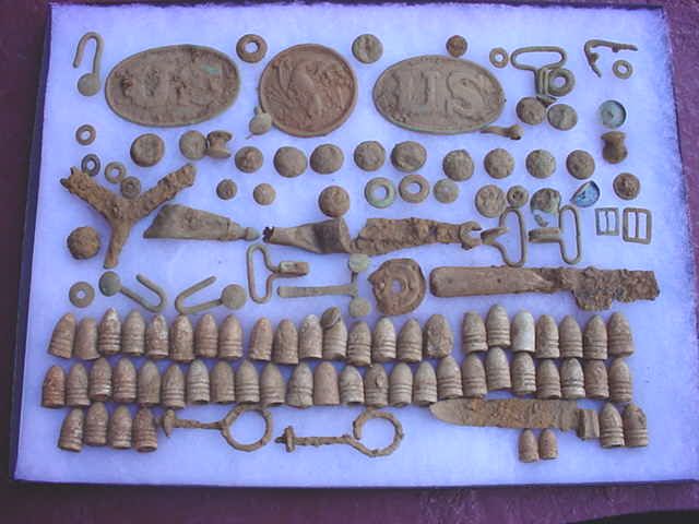 | The DIV committee landed an awesome site once again. The 3 plates from left to right are a U.S. box plate, NCO Burnside breast plate and a U.S. arrow hook buckle. Also some CS Gardner's and a few enfields. Enjoyed the hunt and hope to make the next one. HH!!! March 27, 2006 |