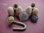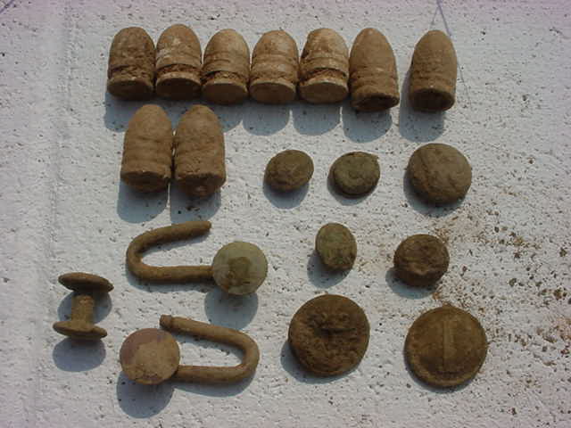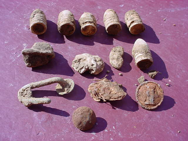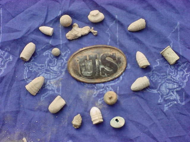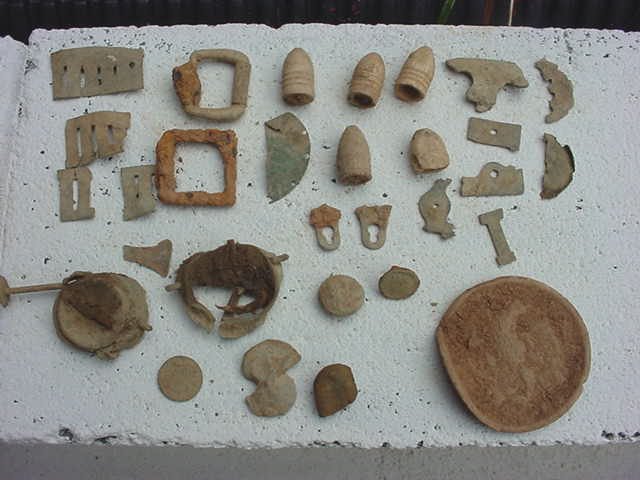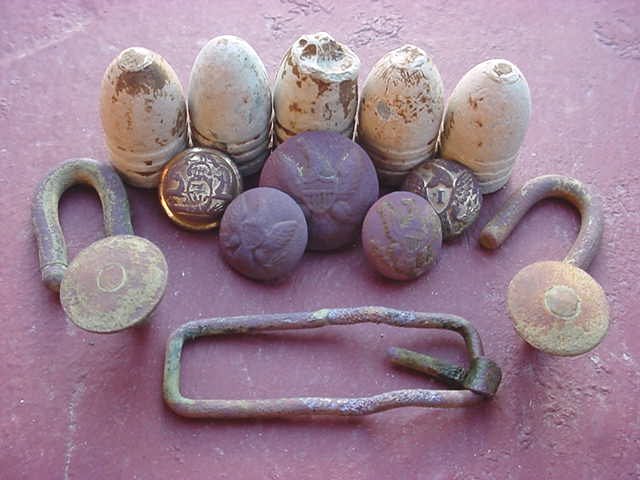 | Found some more goodies over the weekend. US Buckel with all the hooks (arrow) a ball button and an eagle button along with some more bullets. Tony dug his share of bullets along with 2 eagle buttons also. Hope my luck is still good this week for Digging II. HH!!! Oct. 31, 2004