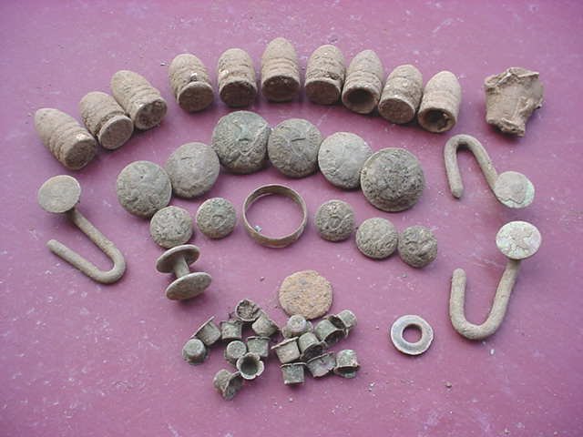 | Went through the outskirts of a camp I've been hunting. Hit a very small patch of woods and found a Union infantry jacket. One of the buttons is a officers staff button. Also found the wedding band and 3 Williams cleaners in the same hole. HH!!! Dec 4, 2005