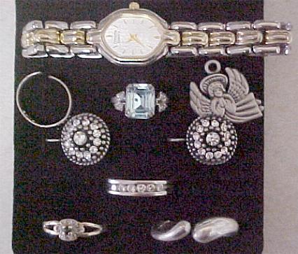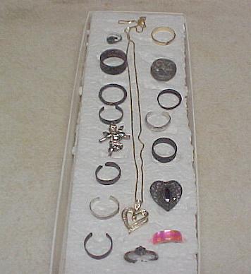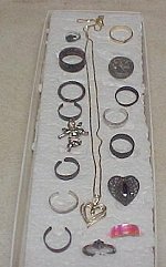 | Not counting all the change, sunglasses, fishing sinkers, toys and miscellaneous "junque," these are the better wet (salt) and dry sand finds Betty made with her Shadow X3 last week at the beach. When the season is over, we'll post her entire summer's finds, which are very impressive! The watch is a nice ladies Citizen, which is still ticking :). There's a silver and blue topaz ring, silver toe ring, pewter angel pendant, pair of silver and CZ earrings, 14kt white gold ring with 6 diamonds, 14kt sapphire and diamond ring, and a Tiffany & Co. silver ring on the lower right. Funny how a name like Tiffany & Co. can hike the value of a piece that would normally be worth very little. Because it is Tiffany, and a Paloma Picasso design, it retails for around $200.00! Without that marking, it would be worth just a couple bucks, so it was a good find. I checked out the diamonds in the band ring, and they are of good quality and weigh 1/3 carat. Betty hunts hard, puts her time in and gets results! Plus, she loves her X3 :). Aug, 25, 2004 |
