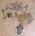 Went to L B I today to check the house...Ate lunch then went to detect....Low and behold where I went there was a wonderful cut....I hunted those 2 blocks for 3 hours and had 277 coins...One siver dime and a gold chain with a ??medalion or something ...Says pure gold Paris france on one side and 24 with a large K under that and gold under the K...The chain clasp has 14 k Italy...I am soooo excited....Will try to get a picture of this.....It was 60 degrees on the beach believe it or not for the week before CHRISTMAS..... Here's what Betty found on the beach. Dec. 16, 2005 |