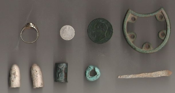 Hello, my name is Brian Frye I live in Kingsport, TN. I have been metal detecting for almost 7 years. I enjoy metal detecting for jewlery, old coins, and civil war relics I also enjoy shallow water hunting. My favorite areas to hunt are, old home sites, churchs, schools, civil war sites, and beachs. Ive been detecting with a shadow X2 since 1998 and I recently purchased a Shadow X5 (Both made by Troy Custom Detectors). Ive put togeather some pictures of my finds, I hope you enjoy them! 1 - I found these items at a construction site on a riverbank. Ring, coins, heelplate, bullets, copper indian bead, and lead pencil. Found with X5 2 - A trip to the old part of town earned me these 2 old quarters. Found with X5 3 - Script "P" Button Found with X5 4 - The man who owns the land where I found these bullets said most people detect one time and he never sees them agian. I think its a pretty good spot. I plan on going back. Found with X5 5 - My X5 works real well on these small gold earrings. 6 - Anyone getting married? Anyone getting married soon?