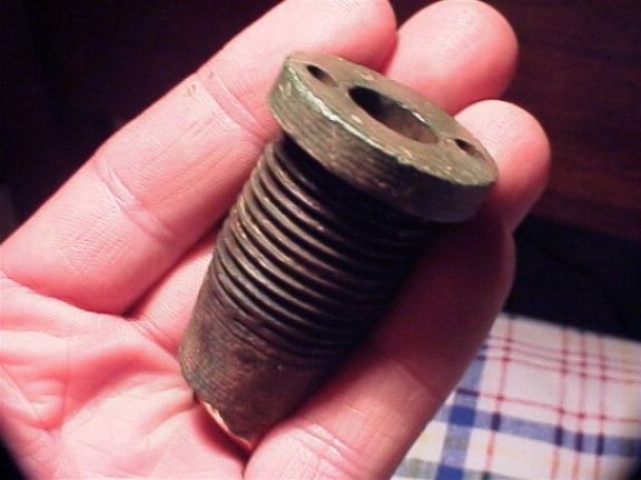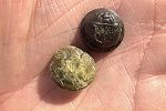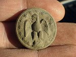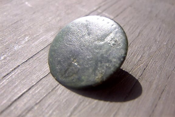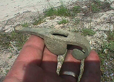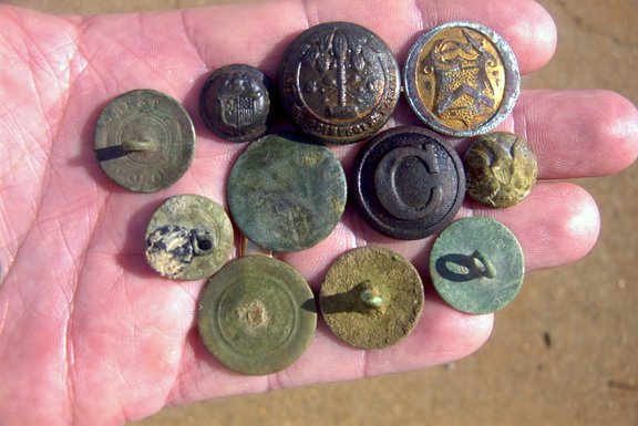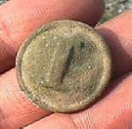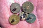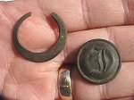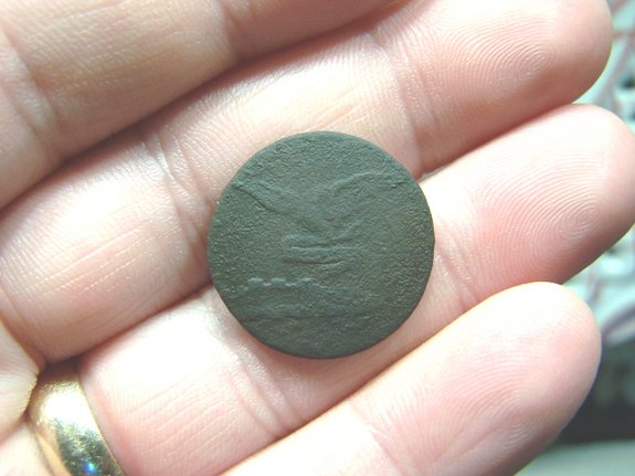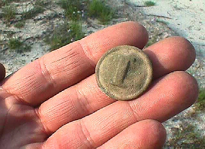 I joined Bill on a few of his sites around Beaufort. We didn't go in with a lot of expectations so as not to get dissappointed. It turned out however, to be my best button day in 4 years of relic hunting. The Shadow was HOT! Here's the scoop. Oh yeah, let's get the silver out of the way...dug this 1855 seated dime...man, this site was hard on silver... Next we'll get the common flat buttons out of the way. I ended the day with 6, but one turned out to be a little different from the rest...more on that later... Next a couple of Yankee cuffs...a general service eagle and a nice dark chocolate brown NY. I dug another Yankee button as well, but it was of a much less common variety...here's a before cleaning picture...can you tell what it is? And after some careful cleaning... If you've got your Albert's handy, it's an FD1, one-piece Revenue Cutter Service button. The RCS became the RCS in 1862 and eventually would become known as the Coast Guard. A super period button! With a great backmark...*U.States*Revenue Service* I asked Bill if any state buttons had been dug in here, and he said, "one, a South Carolina". I'd take a South Carolina! And I did! We kept joking around because this site was a "known" Yankee camp, but I guess it's also now a "known" Confederate camp too, as about 30 minutes after the SC I dug this! Confederate Cavalry, Roman C on lined field. Chatwin & Sons * Birmingham bkmk. The big surprise of the day came when I got home and started doing some cleaning. I always clean my flat buttons "just in case". We'll it paid off. Something caught my eye on one of them...it was the outline of an anchor...and as I turned it in the light I could see a very worn NA10 ca. 1802 Navy button appear! This is about as good as I could get with the picture. The details are much more clear in-person...Clean those flat buttons! Total button count on the day...11. 5 flats and 6 military. It was a great day! Sure beat laying in the sun getting sandy! Thanks Bill! Greg - Saturday, 31 July 2004