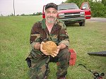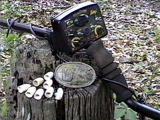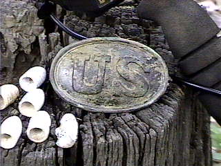 Went hunting Saturday May 3rd, 2003 with my partners Richard, Boyd and Keith. We went back to the Union honey hole that we had found a year and a half ago. (see story in "Union Camp Finds") We had pretty much pounded this place with other brand of machines, so we thought we would give our X5's a try. At about 11am all I had was 7 minies, one carved minie and a few pieces of camp lead. I was hot and thirsty, so I headed back to our base area to get something to drink. After cooling off a bit I decided to hunt this area, which we had really pounded in the past. After a few minutes and about 50 feet from the base site, I had gotten a good solid signal next to a large Oak tree and under a maze of large roots. I started to leave it because I couldn't even get my shovel in the ground, but I thought, what the heck I have plenty of water and my dew rag close by. I moved out from the roots about a foot and a half, dug down and tunneled under the biggest root to no avail, just more roots. So I did more digging and chopping for about 30 minutes, I was wearing myself out. By this time everyone else was coming back to get something to drink, I felt like the Calvary had just arrived! So I had gotten Rich's file and sharpened the blade on my shovel, (what