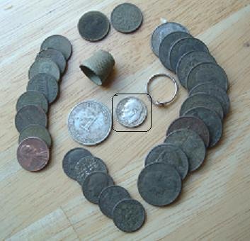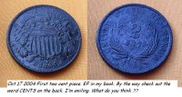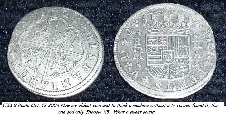 I topped my OLDEST coin twice this week. Went from a 1788 Conn. down to a 1786/7 Vermont down to a 1721 Two Reale. Now my fourth FIRST this week. The Vermont, The Two Reale, The I'm not telling yet and now a beautiful 1864 Two Cent piece in EF. You know for someone who's only had a Shadow X5 for Three months and doesn't know what he's doing and calls it a simple machine to run, I'm having one H$#^& good time this summer. Don't anyone burst my bubble and tell me I'm doing it wrong cause the coins don't know that. HAPPY HUNTING. Oct. 17, 2004